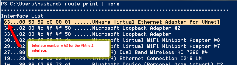 The output of this command should just state that the command completed ("OK"). This command will add a route specific to the 192.168.10.254 address (hence the 255.255.255.255 mask). The first occurrence of this address is the destination address, the second occurrence of this address is the gateway address (the actual virtual router). The metric of 30 is low enough to override the default settings in the routing table. The interface that is selected for this route is based on the interface number specified (IF 63).