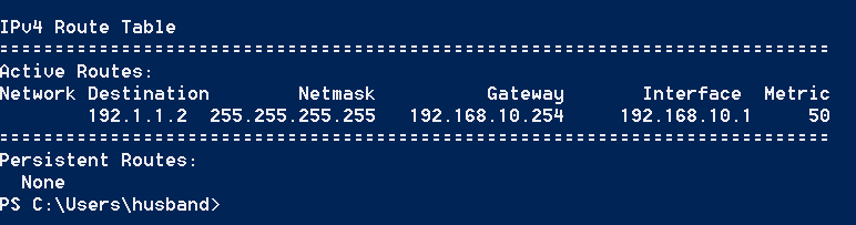 route add 192.1.1.2 mask 255.255.255.255 192.168.10.254 metric 30 IF 63