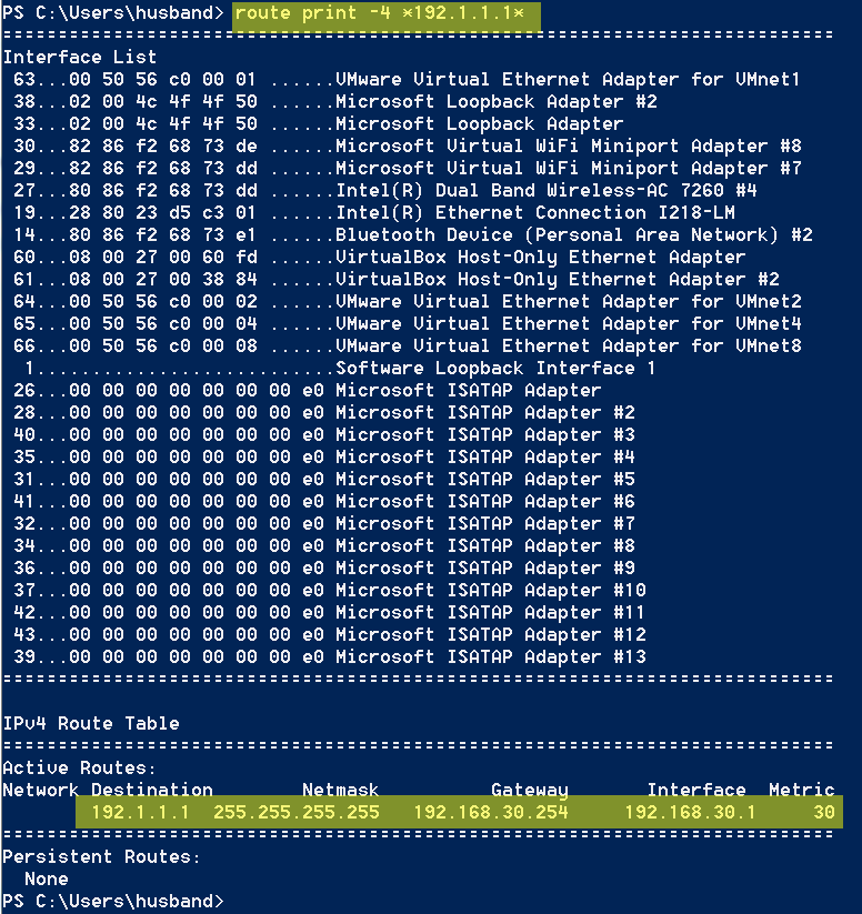route add 192.1.1.1 mask 255.255.255.255 192.168.30.254 metric 30 IF 64