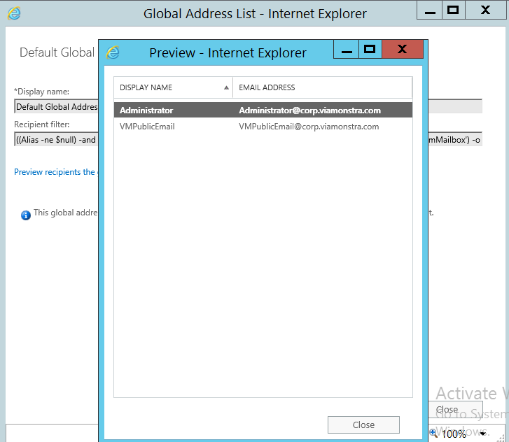 When you open the Default Global Address List and then click Preview recipients, a display similar to the image below will show the outcome of the Recipient filter. You may have additional users.