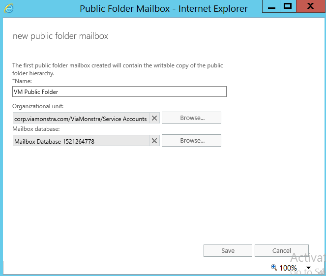 For Viamonstra, create a public folder mailbox called "VM Public Folder" as follows: