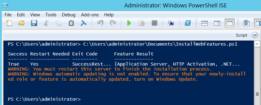 The script in the text box below should be copied and pasted into your Windows PowerShell ISE interface and then run as administrator. This will install the required web features needed as prerequisites to the Exchange Server 2016 install.