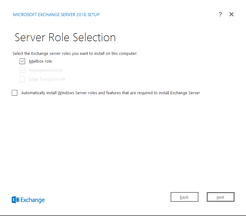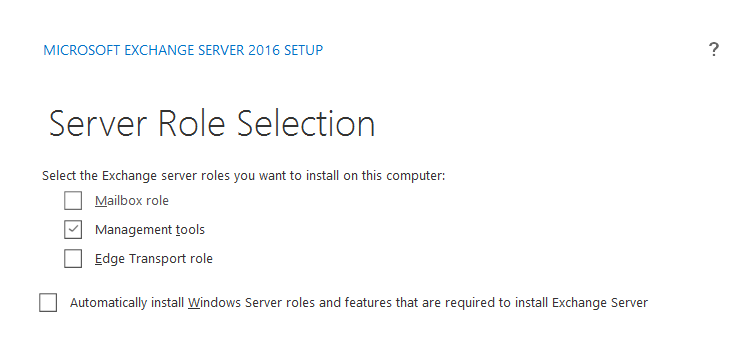 - Step through the wizard until you get to the prompt asking you whether you want to install the Mailbox role, the Management Tools, or the Edge Transport Role.