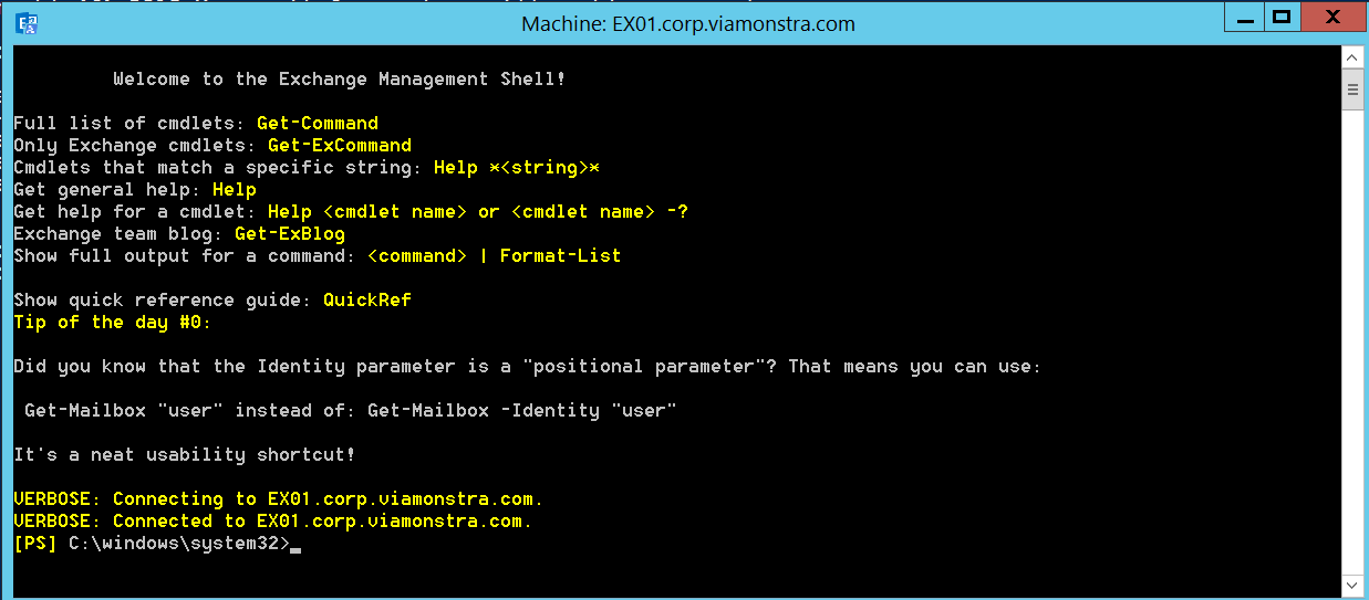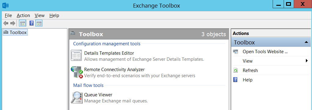 Once you have the tools installed you can manage the Exchange server remotely using both PowerShell commands and GUI interfaces. Exchange PowerShell commands are available to you through the Exchange Management Shell (see image below). Also, you now have the Exchange Toolbox which will give you access to tools that can be used to troubleshoot and analyze your Exchange infrastructure. Both the Exchange Management Shell and the Exchange Toolbox are already installed on your EX01 virtual machine.