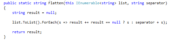 - Change how the Flatten method is called so that instead of passing in an IEnumerable<string>, the method is called on the IEnumerable<string>
