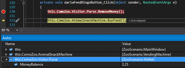 However, if I set a breakpoint on the call to RemoveMoney and press F10, the debugger will execute all of the code within the RemoveMoney method and stop on the next line of code. Notice how the MoneyBalance Value is affected.