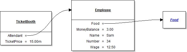 2. This line is an object reference. This line is made whenever an object is assigned to a field. In this case, the Attendant's Food field is a Food object.