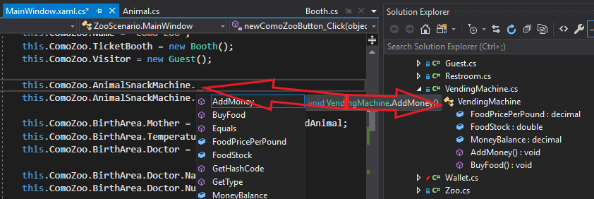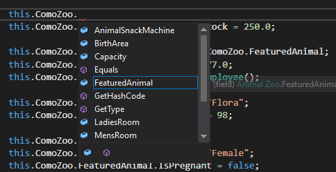 An easy way to see what members belong to what object/class is to expand objects in the Autos Window. In this example, in order to assign the AnimalSnackMachine's FoodStock field you would first need to access the ComoZoo object's members and then the AnimalSnackMachine's members.