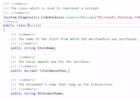 You will see that there are three fields in the Receipt class. StoreName, TotalAmountDue, and AttendantName.