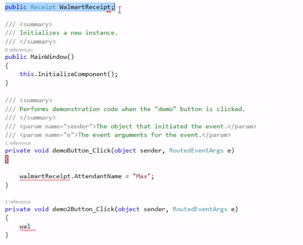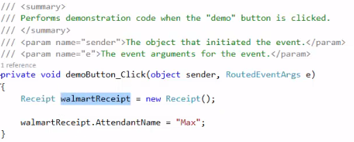 In this example you have a local variable called walmartReceipt that is of the Receipt class. If you click on Receipt() and press F12 you will see the details of the Receipt class.