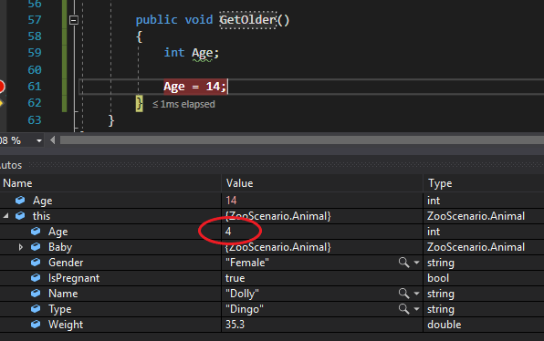Notice how by adding this. to the beginning of Age now changes the 14 from being assigned to the variable to the 14 being assigned to the field (the 4 is now 14).