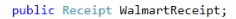 The casing needs to be changed, so walmartReceipt is now WalmartReceipt (due to it being a public field) but it is now able to be used in both methods. The WalmartReceipt does still need to be created, however - The highlighted line of code in the above image does not create WalmartReceipt, it defines it.