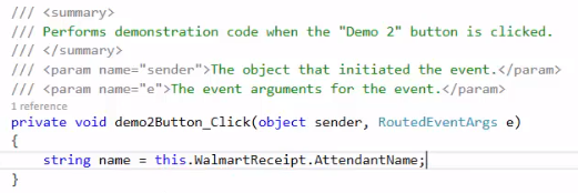 If you try to do anything with walmartReceipt in the demo2 button event handler, you will find that it doesn’t exist. The current method is outside of the scope of walmartReceipt, as walmartReceipt is ONLY inside of the original demo1 button event handler. The walmartReceipt variable would have to be changed to be a field for it to be able to be used in the demo2 button event handler because it is then at a class level.