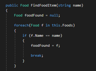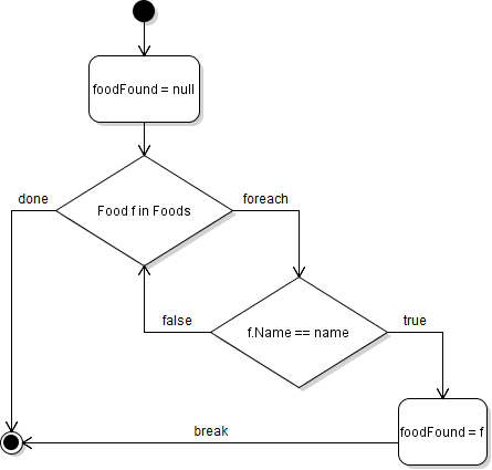 This method defines a local variable of type Food and initializes it. Then it uses a foreach loop to loop through the list of Food objects. When the foreach loop executes, it compares the Name field of the Food object to the name parameter passed in and if it matches, assigns the foodFound variable to the Food object and breaks out of the loop. How to represent this in an Activity Diagram is shown below.