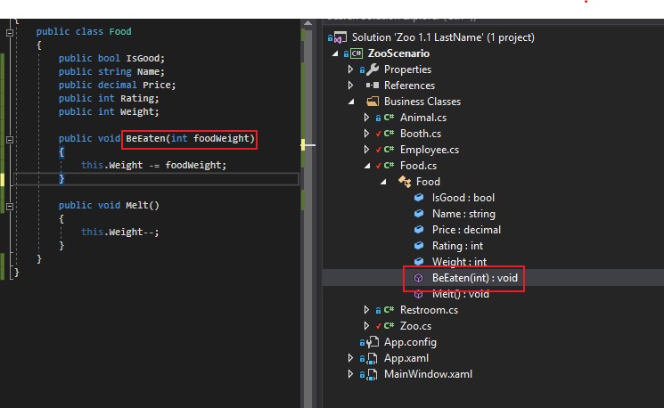 For example, the BeEaten method in the Food class has a parameter.