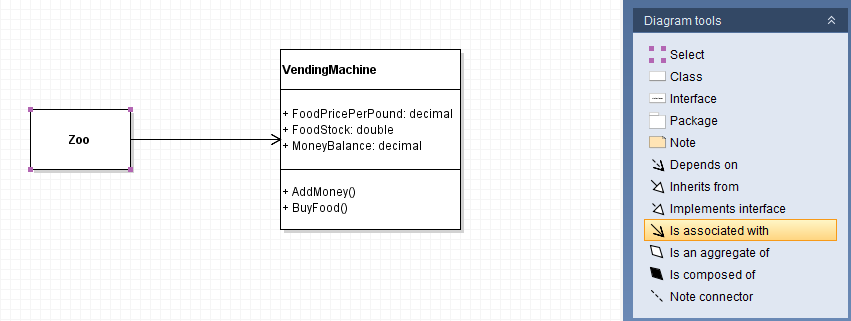 Then, to connect the two, select the 'Is associated with' Diagram tool, click and drag from the Zoo node to the VendingMachine node and release. An arrow should be created that connects them. This relationship is known as a 'has a'. A Zoo 'has a' VendingMachine.