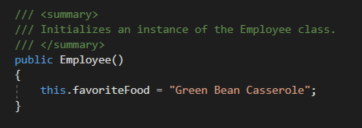 Take the Employee, for example. If every time we instantiated an Employee we wanted them to have the same favorite food we can do that in the constructor by assigning the field in the constructor body like this:
