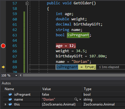 Before lines of code execute, defined fields and variables have a default value assigned to them. Remember that values are only assigned after the line of code executes (the pointer moves to the next line).