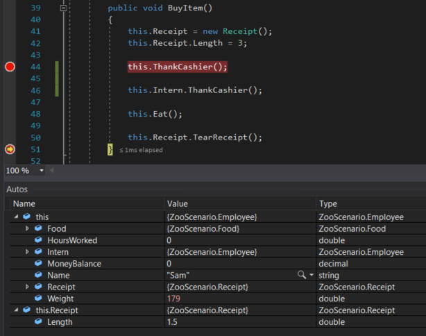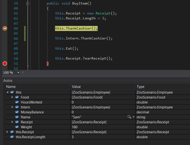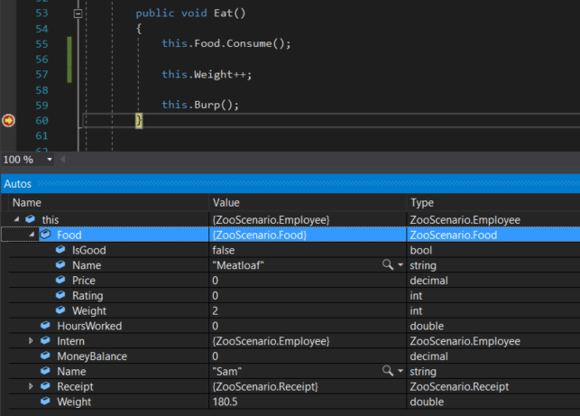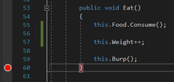 For example, let's say we want to test the functionality of the Eat method to see what happens when we continually have an Employee eat. Let's put a breakpoint at the end of the Eat method.