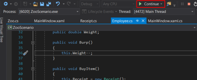 Now we could F11 through the entire method to show the flow and look at the values of objects in depth, but that would take a lot of time. Instead let's use Continue to skip all of that. So let's run the application and click the New Como Zoo button and Attendant Buy Item button.