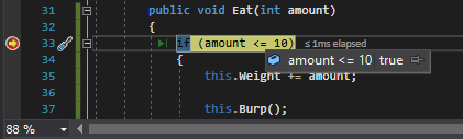 After running the application and hitting the breakpoint it is easy to see that the the amount parameter is 5 and the conditional accepts anything 10 and below so this will evaluate to true.