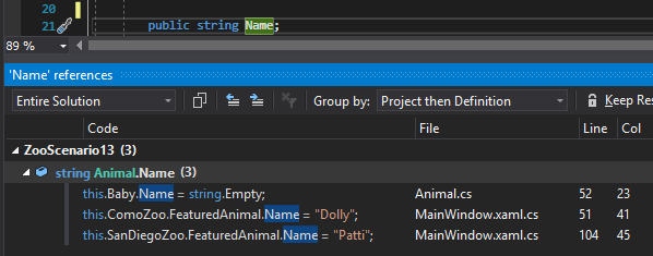 For fields it works the same way, if we 'find all references' on the Name field, it will show me all instances in the code where that field is assigned a value.