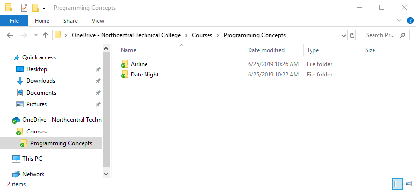 It is best practice to keep your assignments saved in your OneDrive so that there isn't any risk of loss. It is recommended that you store your code based on this file structure: OneDrive > Courses > Programming Concepts
