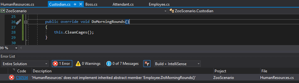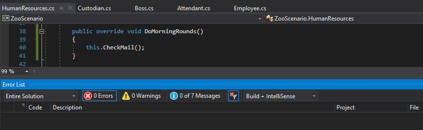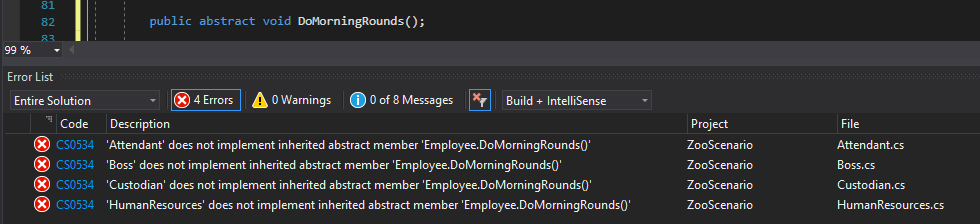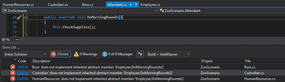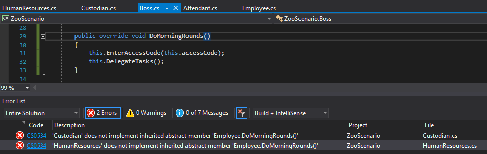 Now that all descendant classes implement DoMorningRounds all errors will go away. Then, if we call DoMorningRounds on different Employee types, they will have their own unique "version" of that method. For example, when I call DoMorningRounds on the Boss object...