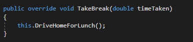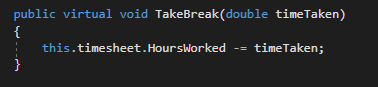 We have a virtual method in the Employee class called TakeBreak that reduces the Employee's HoursWorked by the time they've taken on their break that has overrides in other classes. Having this be virtual means that if the descendant class doesn't have an override this method will execute, but if they do the override will execute.