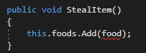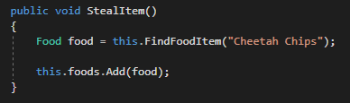 Then in the StealItem method we need to be very particular of whether we want to use the FindFoodItem method in the Attendant class (this) or this FindFoodItem method in the parent class (base).