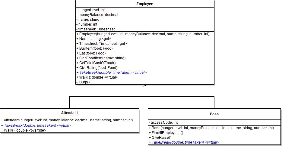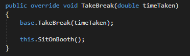 We have a problem, though. The Attendant never gets time taken out of their Timesheet. We don't care about the Boss (they can do whatever they want), but the Attendant needs to have their time recorded or they'll get sacked for time theft. The solution to this is to call the Employee class's (parent/inherited class) TakeBreak method using base.