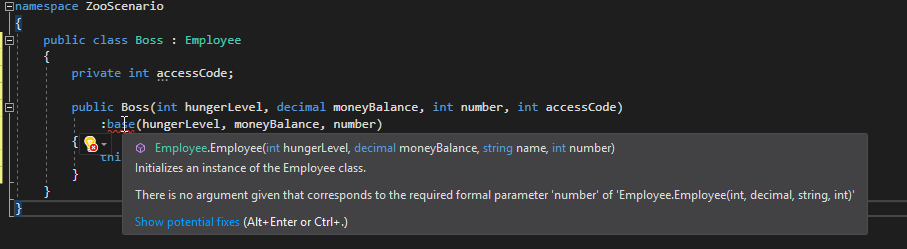 Visual Studio gets mad and says, "hey you were supposed to send me a string for one of my parameters, but it's missing." So what we can do is pass in a hardcoded string to the Employee constructor.