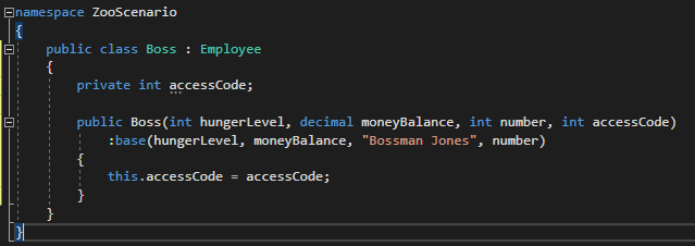 Many times a descendant class will have fields that are unique to them that needs to be assigned to in the constructor. For this example we will revisit the Boss inheriting from the Employee class. So far we have a constructor that passes values to the Employee constructor.