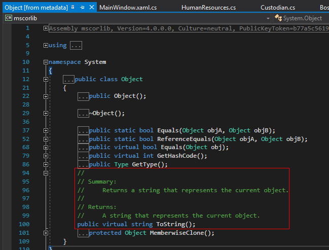 Note that the ToString method is virtual. This means that we can override it if we want to give it a different behavior. Let's see what the default behavior is first.