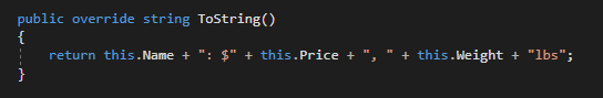 When we call ToString on the Food item, it returns a string of the Value of that object ("ZooScenario.Food"). Snooze, right? It doesn't tell us much of anything. So let's override that method to make it do something better. To do this, we need to override the ToString method in the Food class and give it it's behavior.
