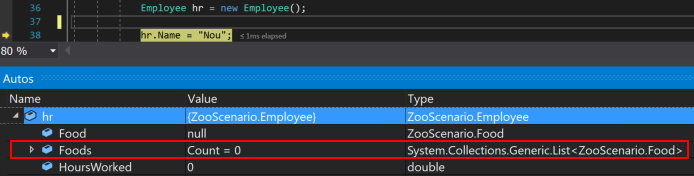 ...we can see that that Foods field is now an instance of a List with a default Count of 0.