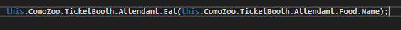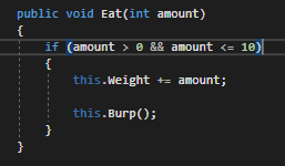 Let's say Sam is really picky and only wants to eat a Monkey Tail or Meatloaf. We will change the parameter of the Eat method to a type of string named 'nameOfFood' and pass in the Name of the Food item.