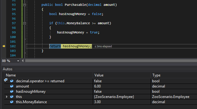 When we step through the Purchasable method we can see that Sam doesn't have enough money and the hasEnoughMoney method will return false.