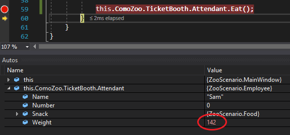 Note that the debugger is on the line after the method call indicating the method has been executed and that the Attendant's Weight field has changed.