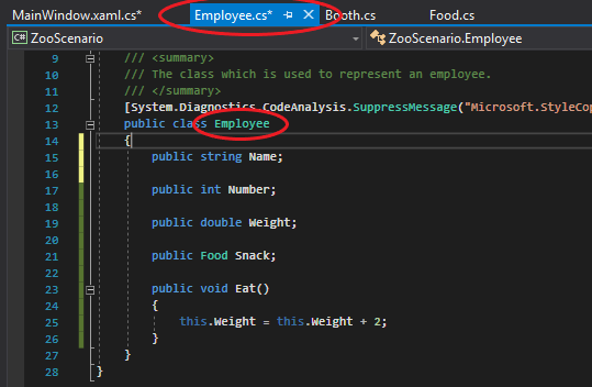 In the case above, the call to the Eat method is located in the method body of the newComoZooButton_Click event handler in the MainWindow class and is called on the Attendant object.