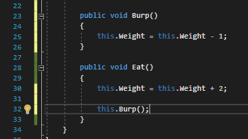 The example above shows a call from one class to another, but methods can also be called from within the same class. So I will add a Burp method to the Employee class and call it when the Employee Eats.