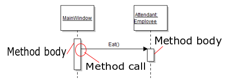 Method calls in sequence diagrams are represented by a line coming from the method body where the call originated to the body of the method itself. The squares at the top of the diagram represent the 'object lifeline'. The object lifeline is notated by Object: Class. In this case the Attendant is the Object and the Employee is the class.