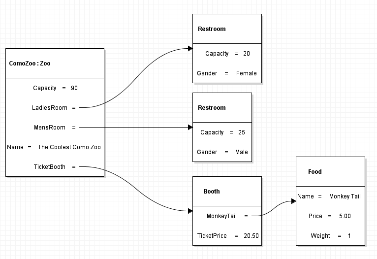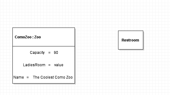 To represent this in an Object Diagram, first insert a field named LadiesRoom between the Capacity and Name fields in the ComoZoo node.
