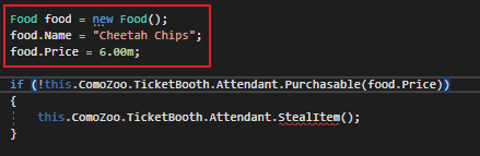 If we execute the code in the StealItem method, we can see that Sam now has the food item passed in to the method as his own Food.