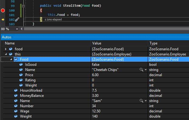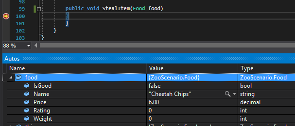If we run the application and look at the food parameter in the StealItem method, we can expand the object in the Autos window and we can see that the food parameter is the same as (it has the same values as) the Food object instantiated in the MainWindow.