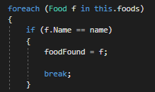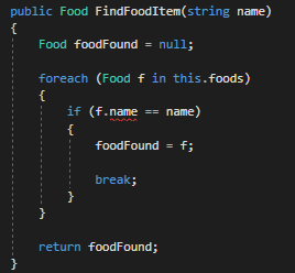 This means that the only place that is accessible is from inside of this class. This poses a problem because we have a method outside of this class that wants to use a Food object's name.