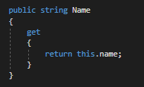 Properties will always be public to allow other classes access to them, the capitalized version of the field it refers to and the return type that is the same as the field's type. Next, we need to indicate that the property wants to "get" something.