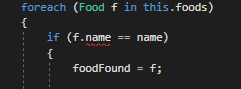 We can get the value from the name field, though, by using a property to "get" the value. To do this we will define a property in the Food class named Name that returns a string.