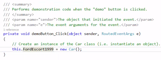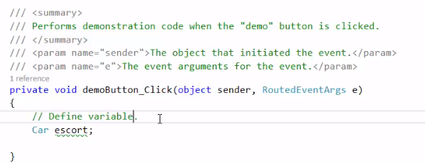So in the MainWindow there is a Demo button. The Car will be referred to in the same way that the Zoo was previously. The type first - in this case Car - and then the name of it, which will be escort.