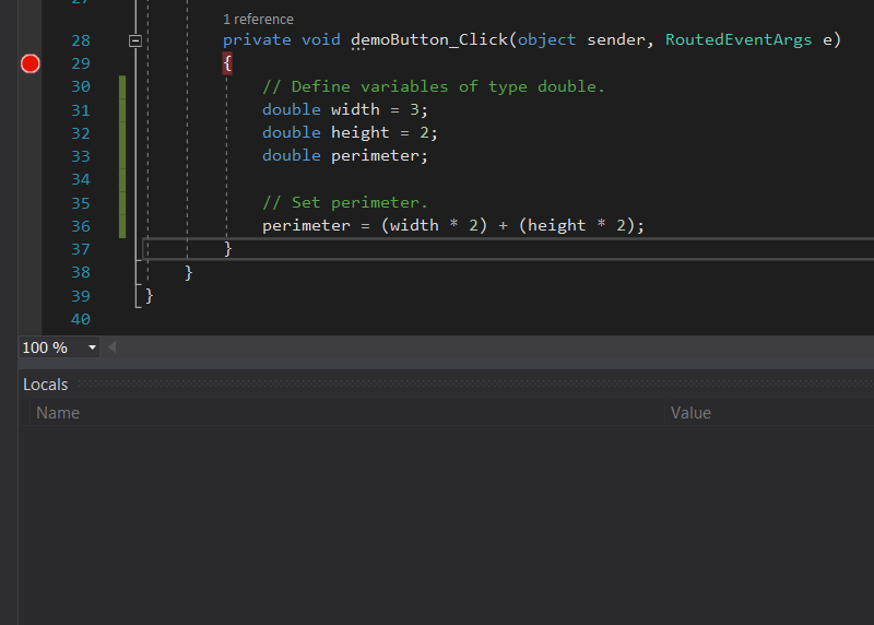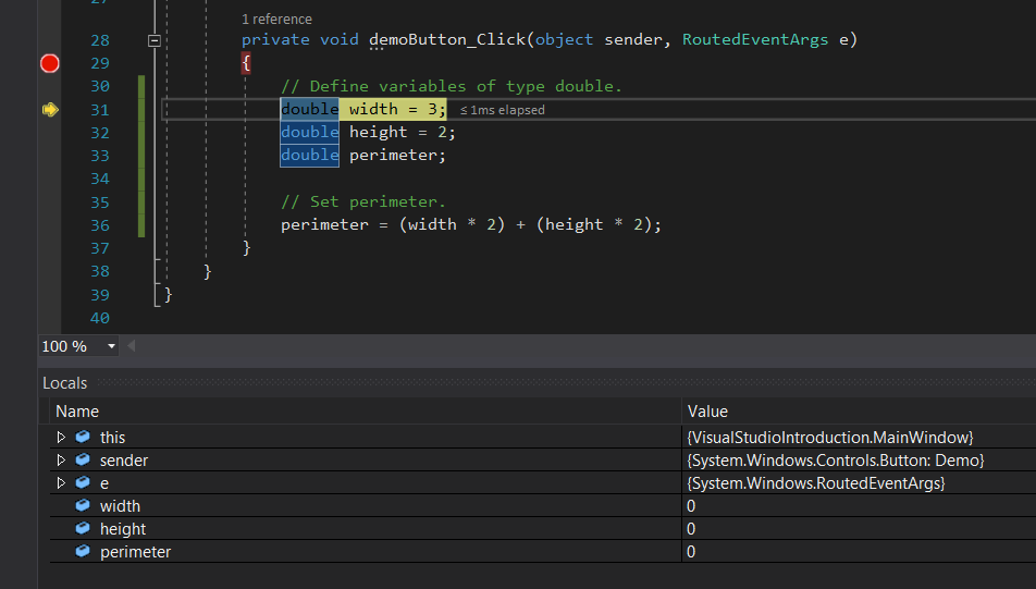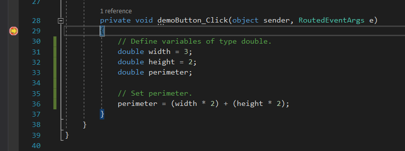 Looking back at Visual Studio for the context of that information: width, height, and perimeter are variables - they live inside of a method. Both variables and fields are placeholders for data. They are a storage location allocated in memory to hold information. The three aforementioned variables are of type double. The first two have a default value specified, and perimeter does not. Booleans in C# default to false, ints, decimals, and doubles default to 0. Strings do not have a default value and are therefore null.